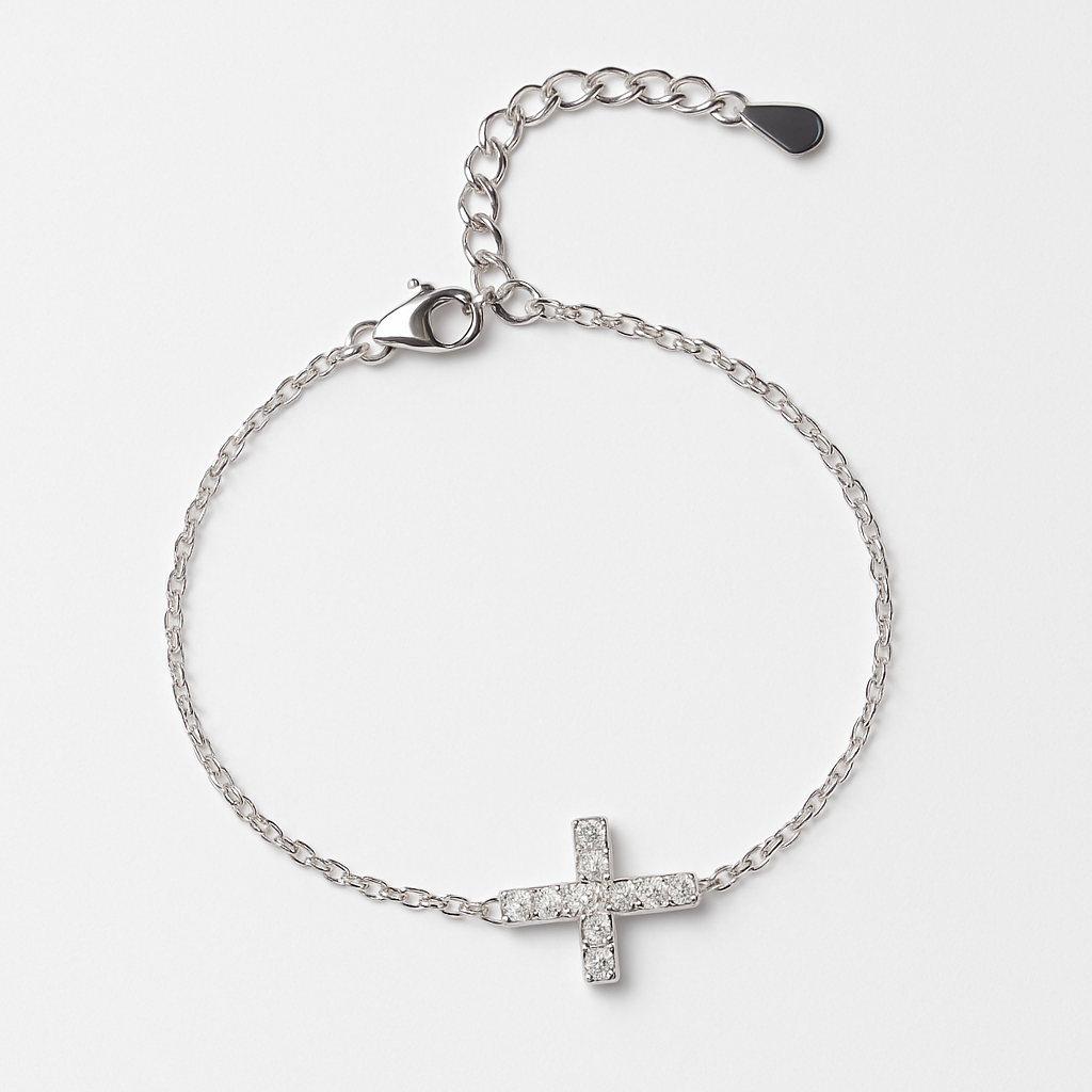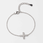 Elegant 925 Silver Rhodium Plated bracelet designed with White Cubic Zirconia studded cross, ideal for layering or wearing solo.