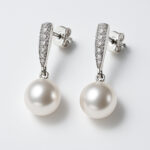Shell pearl drop earrings set in rhodium plated 925 sterling silver, studded with cubic zirconia.