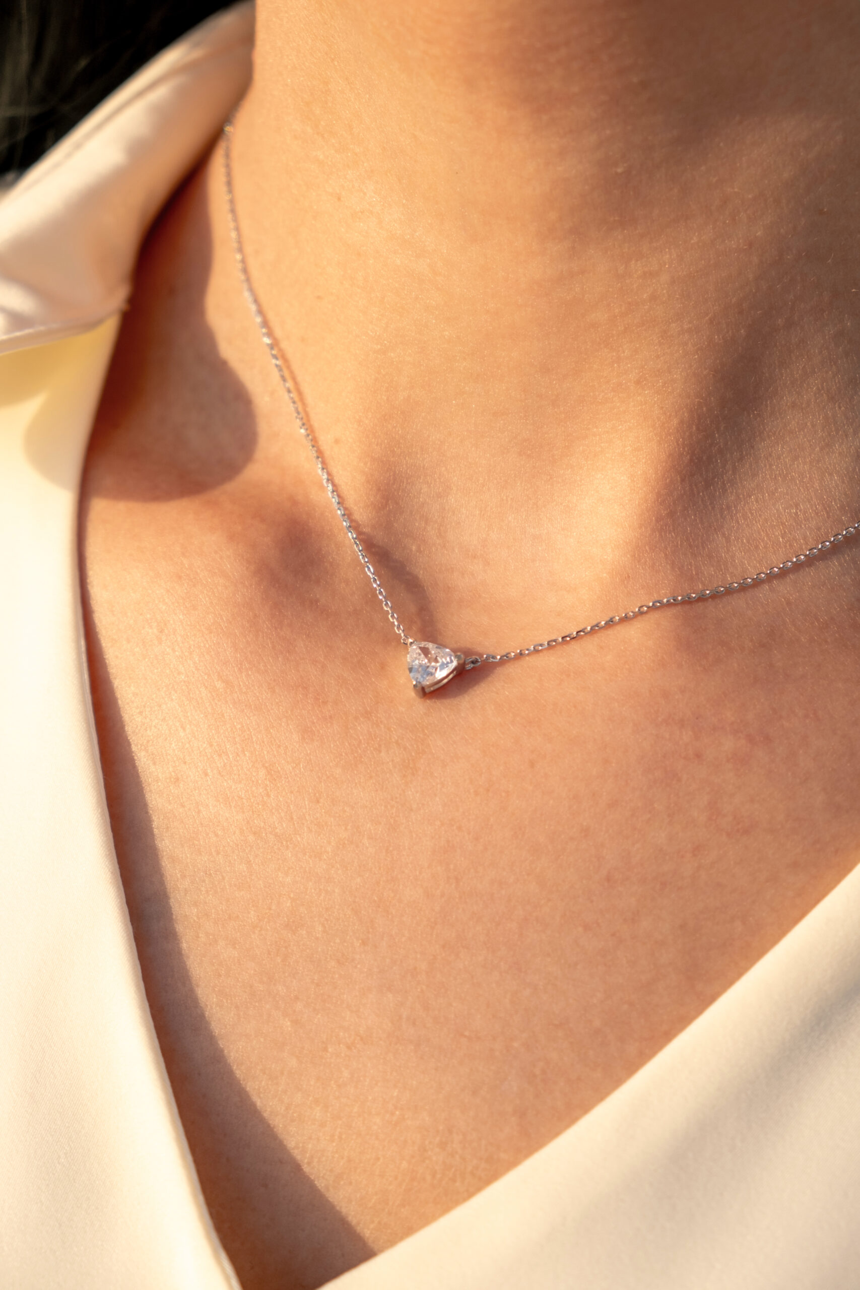 Exquisite 925 Silver Rhodium Plated 1.4mm chain link necklace, featuring white Trilliant cut Cubic Zirconia stone, simple and sophisticated.